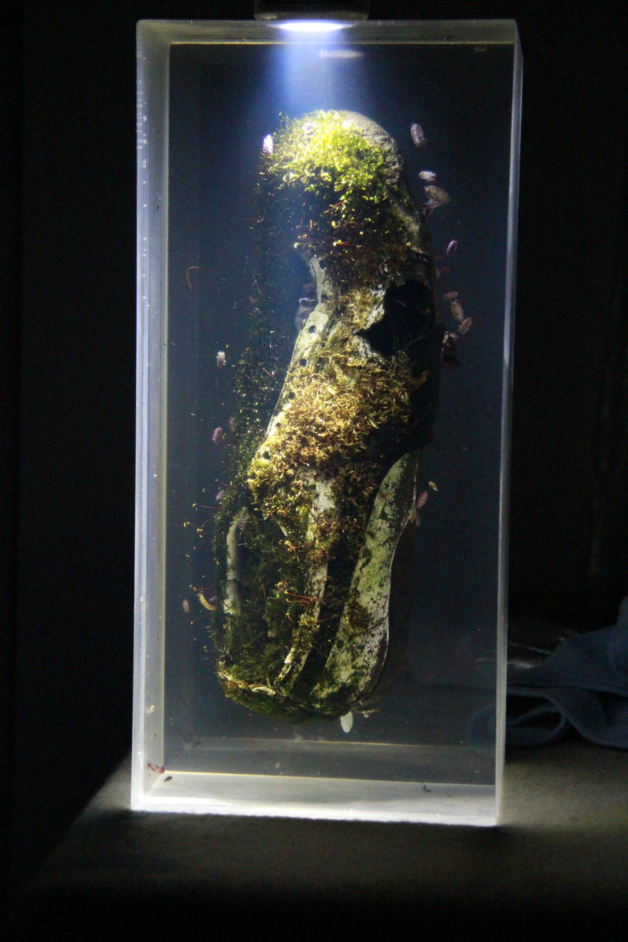 Prachtig verouderde schoen gevonden in een boomstronk, onderdeel van een foto reportage en mooie toevoeging aan de presentatie. De schoen is geconserveerd inclusief al het (ontsnappende) leven in de schoen