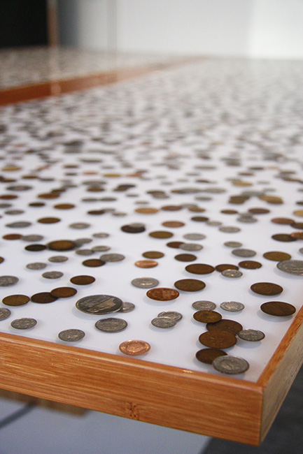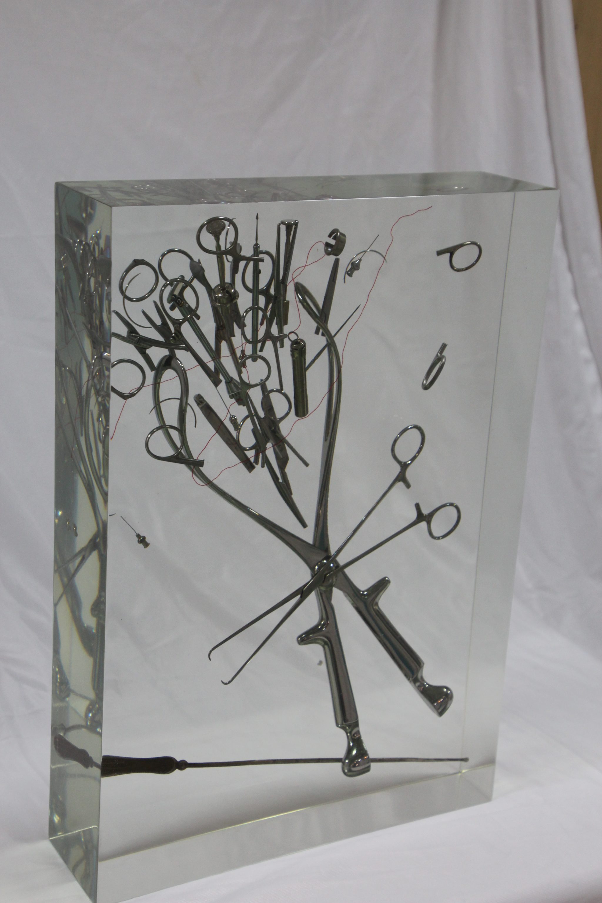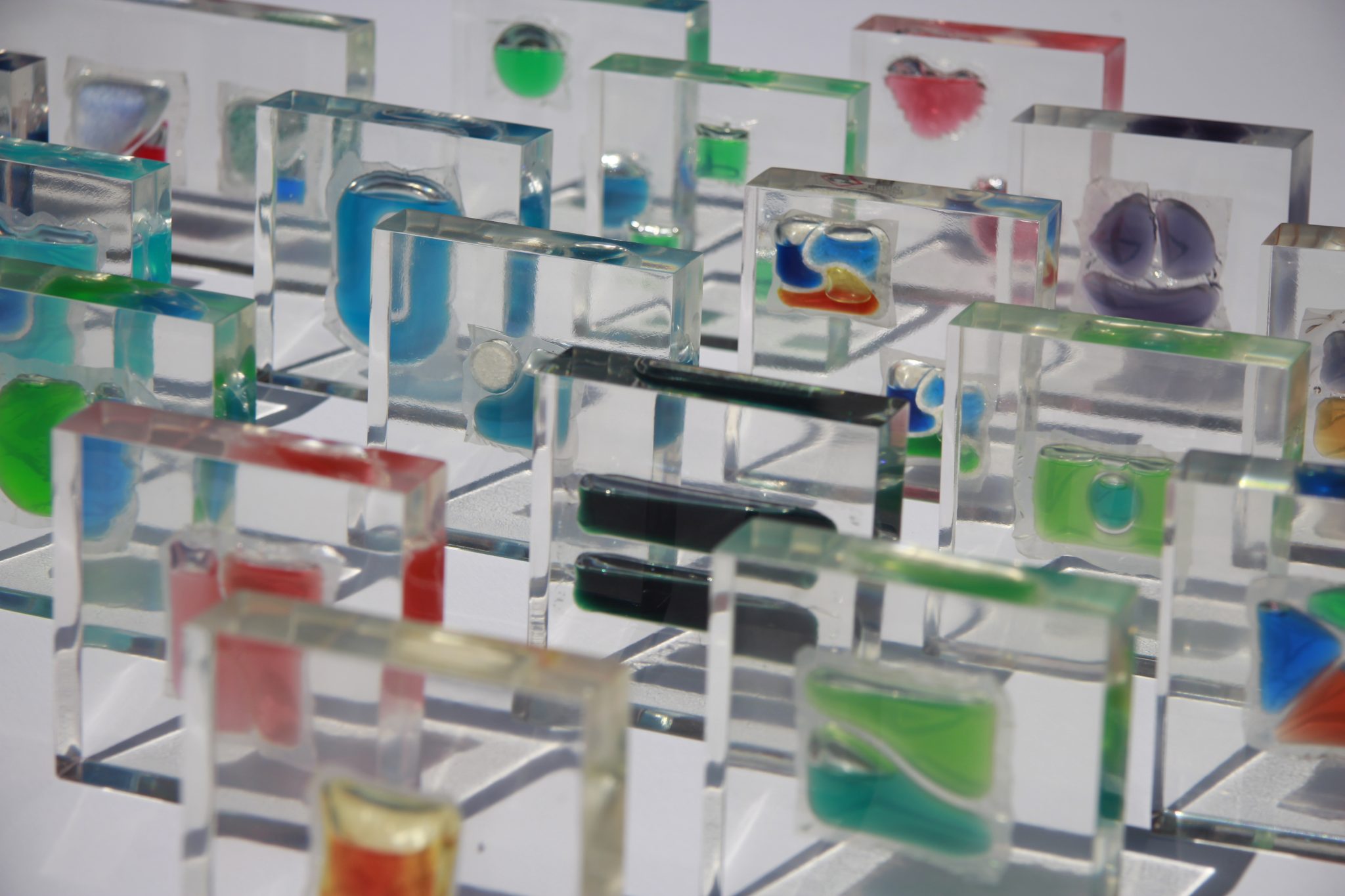 Herinneringen van een werkzaam verleden vastgelegd in een epoxy kunstwerk, met een rode draad als detail. Epoxygieten.nl denkt graag mee over uw herinneringen.